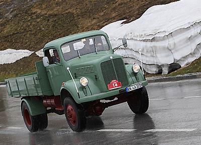von 10: Die Großglockner Hochalpenstraße stellte hohe Anforderungen an Mensch und Maschine. Aber für den Mercedes-Lkw Baujahr 1959 waren weder nasse Straßen noch Schneefelder ein Hindernis.