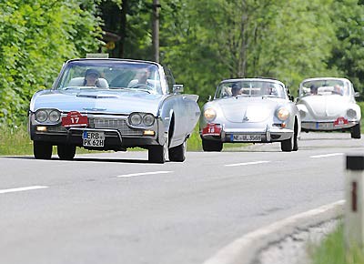 von 10: Parade der Cabrios: Oben ohne fährt es sich doch am Schönsten. Den Anfang macht ein Ford Thunderbird Spezial, gefolgt von einem Porsche 356 und einem VW Käfer.