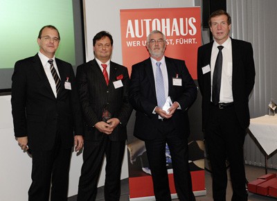 von 9: Unter den Kleinen Importfabrikaten tat sich die Volvo Auto Bank mit der Note 2,01 am stärksten hervor. Die schwedische Marke kooperiert mit den Basler Versicherungen. Im Bild v.l.: Ralph M. Meunzel, Servé Olivier (Volvo Auto Bank), Ralf Wendenhorst (Basler Versicherungen) und Bernd Schmitter von Jäger + Schmitter Dialog.
