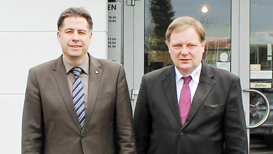 von 2: Geschäftsführer Torten F. Opitz (r.) und Serviceleiter Hendrik Höller (l.) wollen das Autohaus gemeinsam erfolgreich in die Zukunft führen.