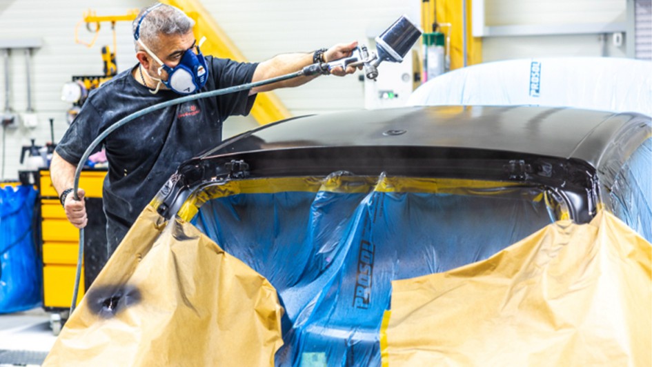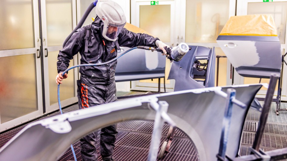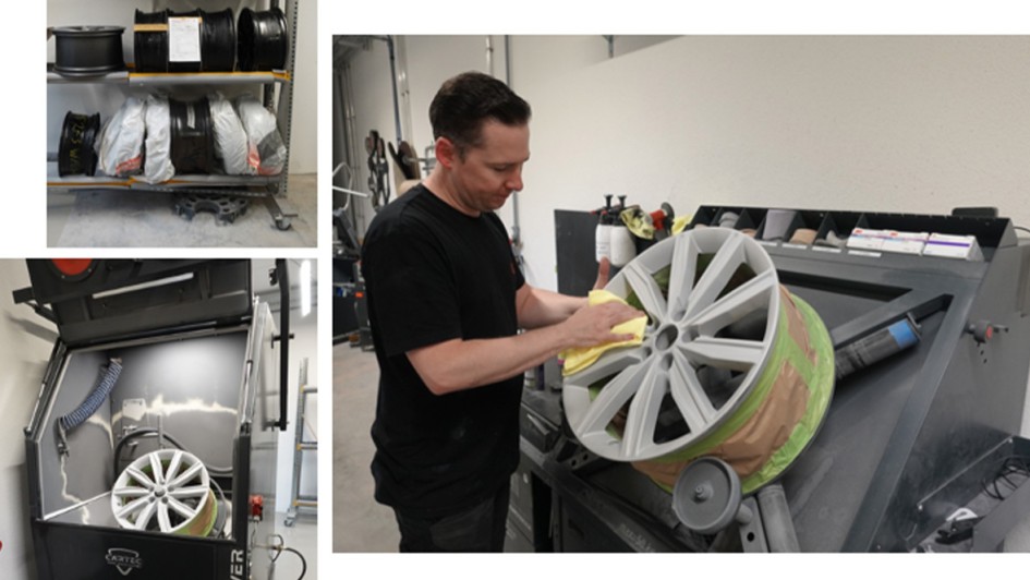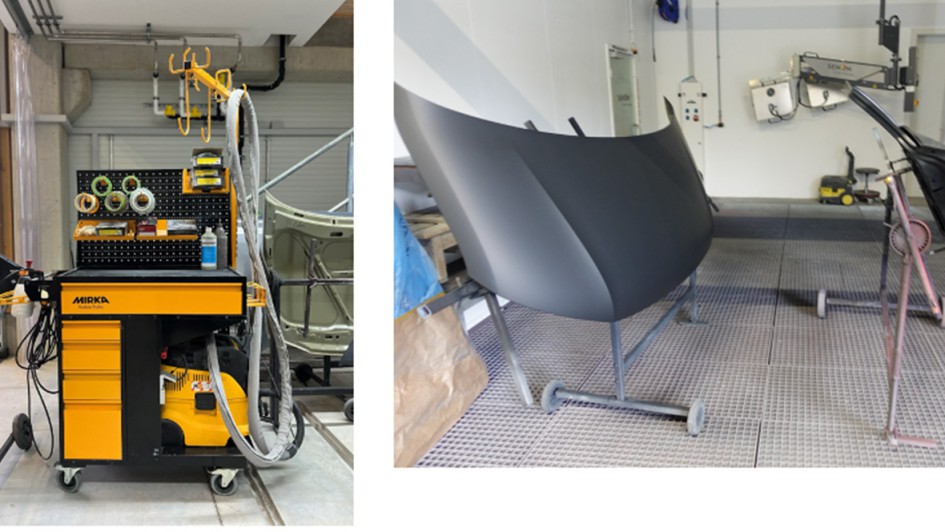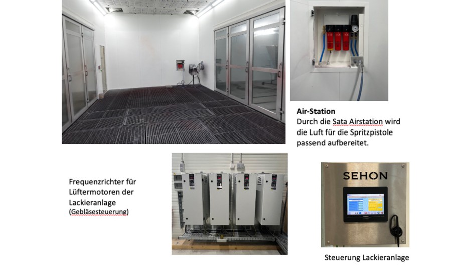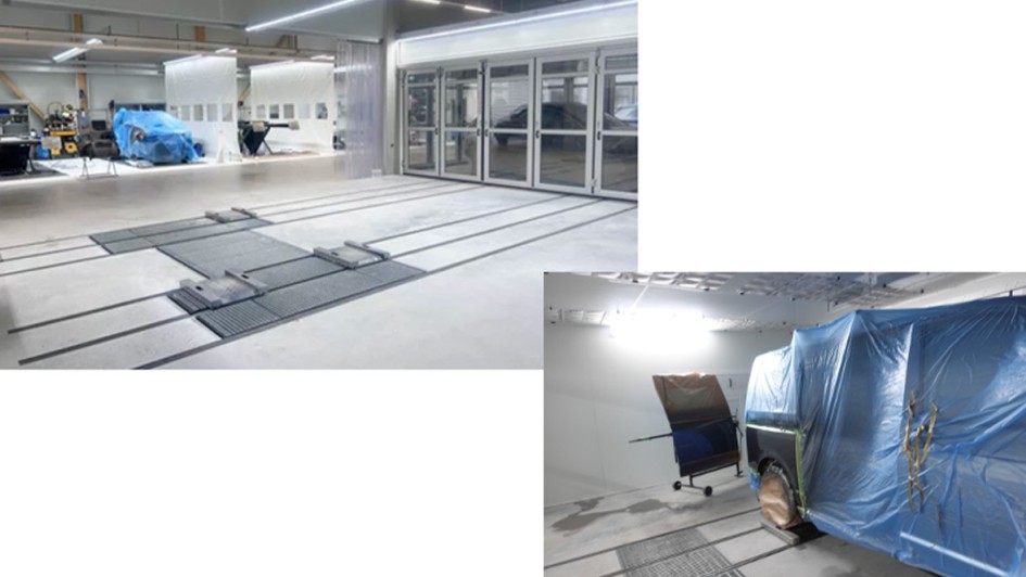 von 15: Querverschub-Schienensystem: Prozessorientierter Workflow durch die Arbeitsschritte Maskieren – Lackieren – Trocknen, ohne das einzelne Fahrzeug unter Motor zu bewegen. Rechts die Trocknerkabine
