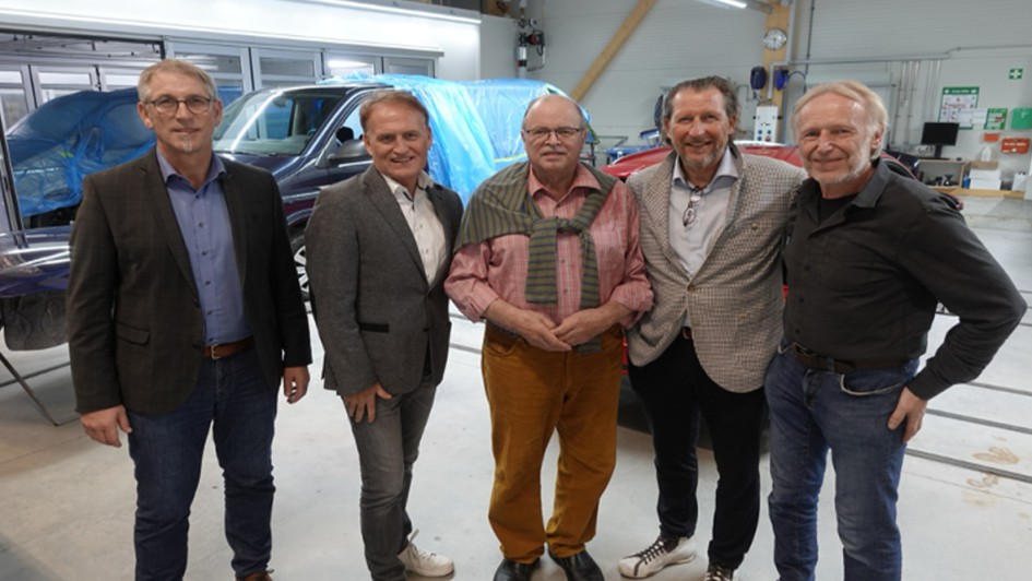 von 15: Die Impulsgeber für die Manufaktur: Manfred Merkel (re.) Lackiermeister, daneben der große Kreator und "Lack-Pionier" Tiemo Sehon, der Staunende über diese professionelle Komplexitätsgestaltung, Prof. Hannes Brachat, der Macher, Innovator und Investor des Ganzen, Inhaber und Geschäftsführer Reiner Heuberger, sowie der wichtige Mitgestalter des Autohauses, Xaver Pfeiler, Mitglied der Geschäftsleitung