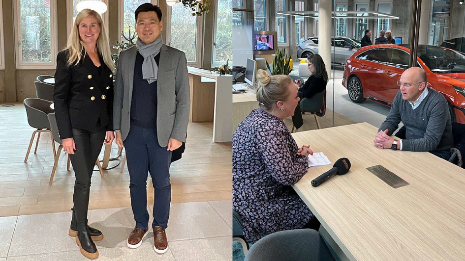von 7: Dagmar König (geschäftsführende Gesellschafterin Auto König) und Peter Lee (Präsident Kia Deutschland) besichtigen den Showroom, während Thomas Djuren (COO Kia Deutschland) ein Radio-Interview gibt.