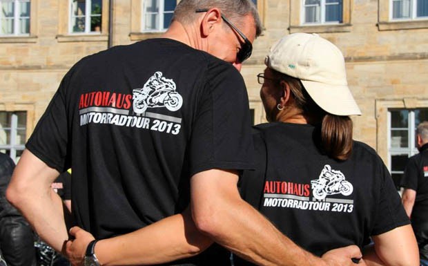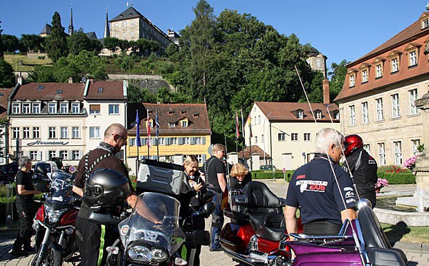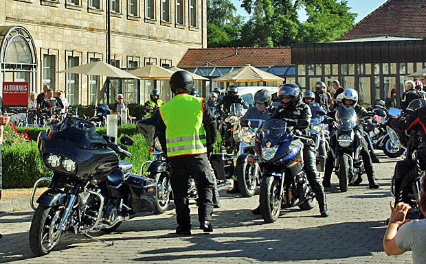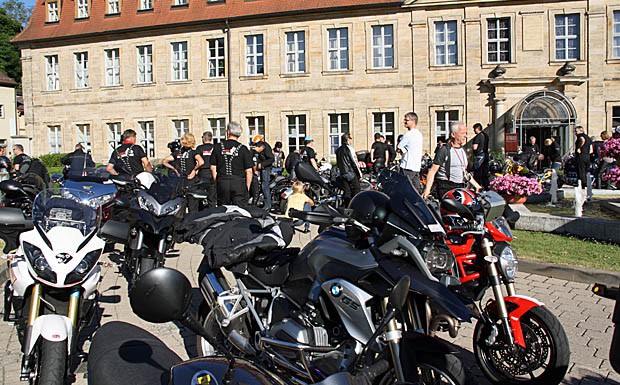von 12: Pünktlich ab 8.45 Uhr gingen bei herrlichem Sonnenschein die drei Motorradgruppen auf die rund 270 km Strecke durch die Haßberge und die fränkische Schweiz. (Bild: Jolanta Sulowski)