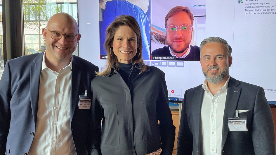 von 15: Philipp Kroschke (Kroschke Gruppe) war bei dem Event live zugeschaltet. Vorne v.l.n.r.: Oliver Kosan (Auto1.com), Keynote-Speakerin Eva Kellershof (otoz mobility) und Robert Lasek (Auto1.com).