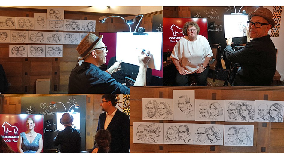 von 16: Porträtist Andreas Otto, der Unermüdliche. Welch hohe Kunst, mit wenigen "Federstrichen" das Charakteristische eines jeden Einzelnen in dieser Sprache zu erfassen. Im Bild auf dem Porträtsessel: Waldtraut Schroff (o.re.) und Martina Ostermaier
