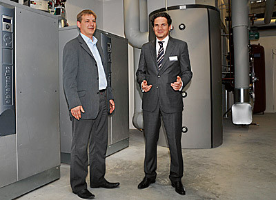 von 10: Peter Reisacher (r.), Geschäftsführer der Reisacher Autohaus GmbH, und Sascha Fuchs von der e-con AG erklären im Technikraum die Funktionsweise der per Contracting gemieteten Wasser-Wasser-Wärmepumpe.