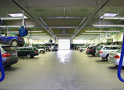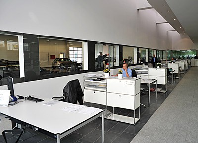 von 10: Den Kunden in der Annahme-"Drive-In"-Halle trennen vom Serviceberater nur Fenster und eine automatische Schiebetür.