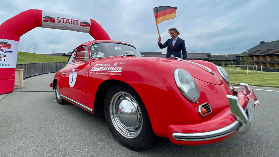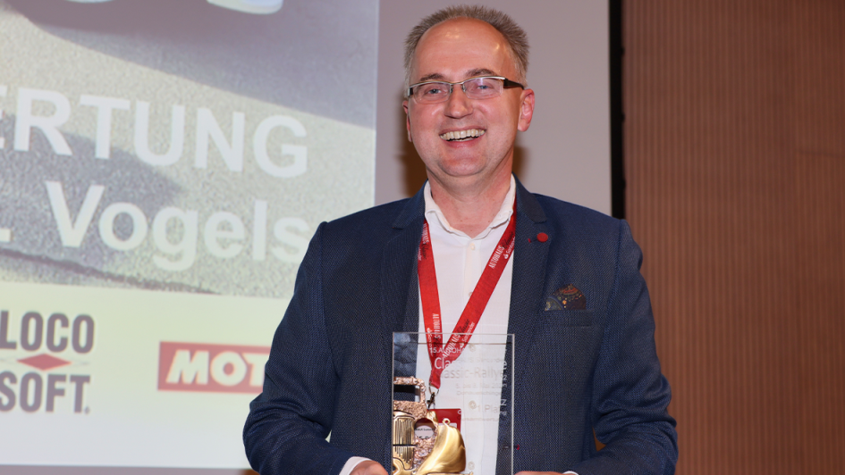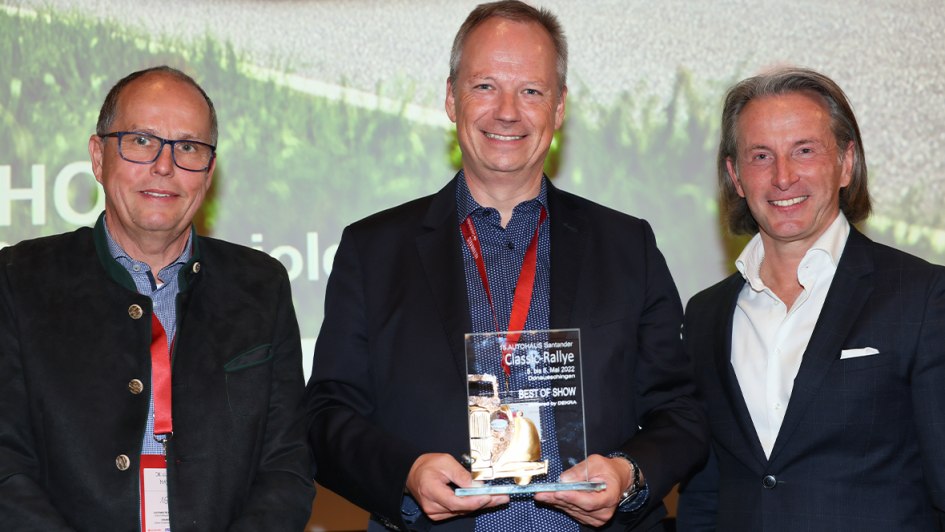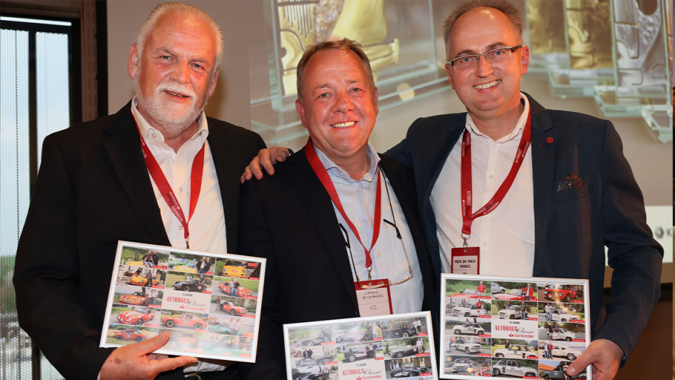 von 16: Die große Rallye-Gala war in diesem Jahr zugleich auch eine Geburtstagsparty zum kleinen Jubiläum der Oldtimer-Ausfahrt. Drei Ehrengäste durften dabei besonders im Rampenlicht stehen – nämlich die Classic-Teilnehmer, die seit 2008 bei jeder einzelnen Tour an den Start gingen: Peter Göhringer, Clemens Betzemeier und Prof. Dr. Tim O. Vogels (v.l.n.r.).