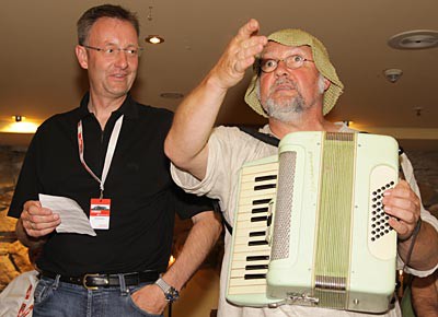 von 12: Völkerverständigung auf sächsisch: Ein Musiker-Duo unterhielt die Gäste während des Abends und sorgte für ausgelassene Stimmung, hier mit Uwe Buchmann vom Autohaus Buchmann Hannover.
