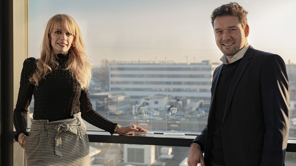 von 11: Sieger in der Kategorie "Deutsche Volumenfabrikate": Volkswagen / VW AV - Nicole Hummes, verantwortliche Produktmanagerin Kfz-Versicherung bei Volkswagen Financial Services, und Henning Junker, Leiter Vertrieb Volkswagen Autoversicherung. Sie freuten sich auch über den ...