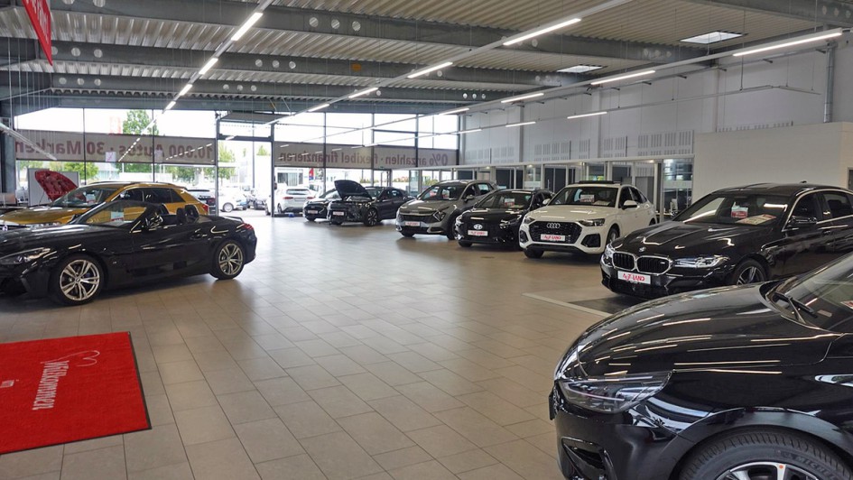 von 16: Ein Blick in die große überdachte Verkaufsarea. Hier wird eine handverlesene Auswahl an Fahrzeugen präsentiert. Die geschlossen Verkaufsräume, die Wirkungsplätze der Verkäufer, befinden sich hinten rechts und links.