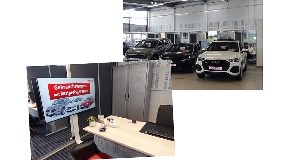 von 16: Ein Blick auf die Verkaufsräume. Diese sind in der gesamten Autoland-Gruppe einheitlich aufgebaut, so dass jeder Verkäufer sich sofort zurecht findet und stets auch flexibel einsetzbar ist. Dazu gehört, was jeweils auf den Verkäufertischen zu präsentieren ist, unter anderem eine kleine Stehle mit dem Hinweis: "Bitte zahlen Sie bargeldlos." Ein großer Bildschirm schafft die Möglichkeit, dem interessierten Kunden jedes Modell, das in der gesamten Gruppe steht, zu präsentieren. Es sind 10.000 an der Zahl. Auch für die Gebrauchtwagen gilt: Bestpreisgarantie. Es wird besonderen Wert darauf gelegt, unmittelbar vor Ort gezielte Inzahlungnahme zu praktizieren.