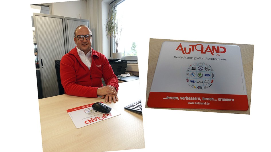 von 16: Niederlassungsleiter Karl-Fabian Dahnert hat von seinem Arbeitsplatz aus visuelle Übersicht über das Verkaufsareal. Jeder ankommende Interessent muss sofort angesprochen werden, unabhängig von Alter, Geschlecht, Aussehen usw. Jeder Kunde ist ein Markt! Wir konnten beobachten, wie Dahnert sein Verkaufsteam live steuert. Und Dahnert hat als Mauspad zugleich ein wichtiges Motto des Unternehmens vor sich liegen: "…lernen, verbessern, lernen… erneuern!" So wird das Bewusstsein für Veränderungsbereitschaft hoch gehalten.