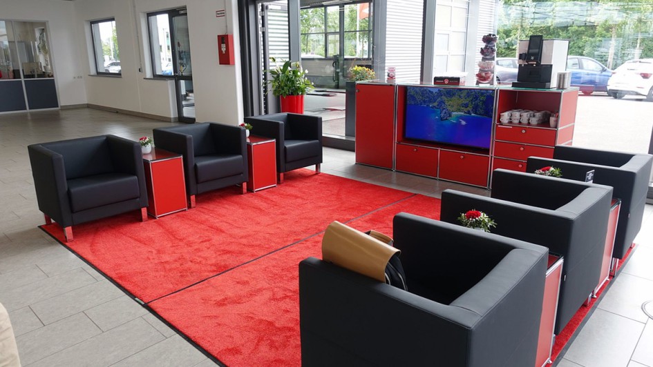 von 16: Ein Blick auf die Aufenthaltsarea für die Kunden. Mit bequemen Sesseln, Blumenschmuck, informierendem Bildschirm und einer Getränkebar, die frei zugänglich ist. Der rote Autoland-Teppisch gibt dem Ganzen ein wirkungsvolles Grundfundament.