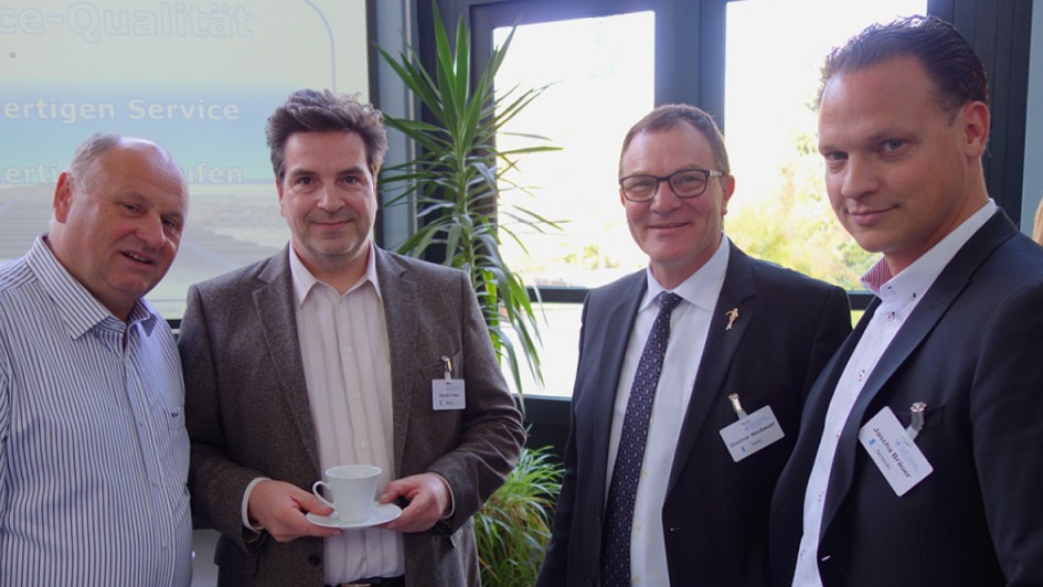 von 22: Pausengespräche (v.r.): Jascha Bräuer, Handelskommunikation Automobile Santander, Dietmar Neubauer, Veedol-Vertriebsleiter, Derek Finke, Modix, und Helmut Peter, Mercedes-Vertreter und BFC-Vorstandsvorsitzender, der heute seinen 57. Geburtstag feiert. Herzlichen Glückwunsch!
