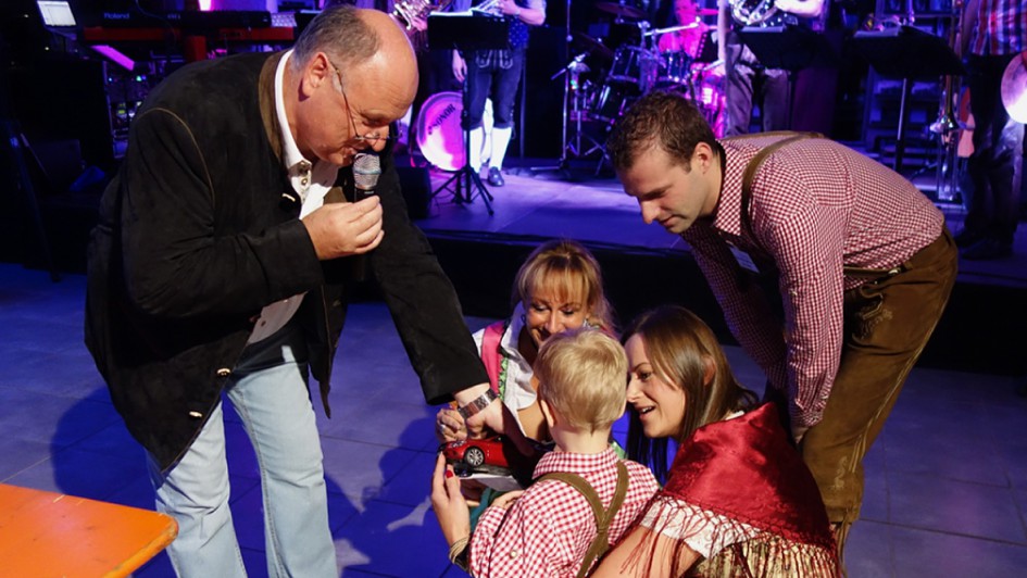 von 22: Der jüngste Partygast, Alexander, wurde von Helmut Peter mit einem Modellwagen ausgezeichnet. Alexander mit seinen Eltern Karl Weingärtner und Frau.