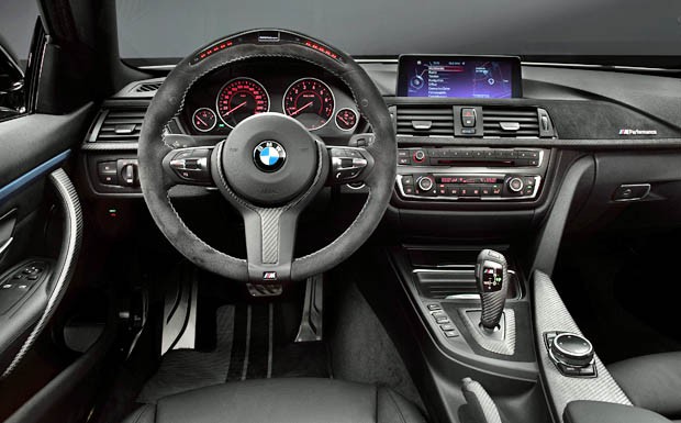 von 8: Für das Cockpit haben die Münchner ein Sportlenkrad mit einem integrierten Display sowie Carbon-Ausführungen für Schalthebel und Handbremsgriff im Angebot.