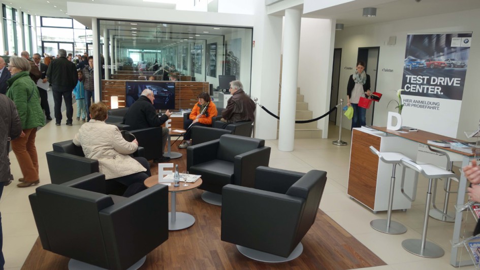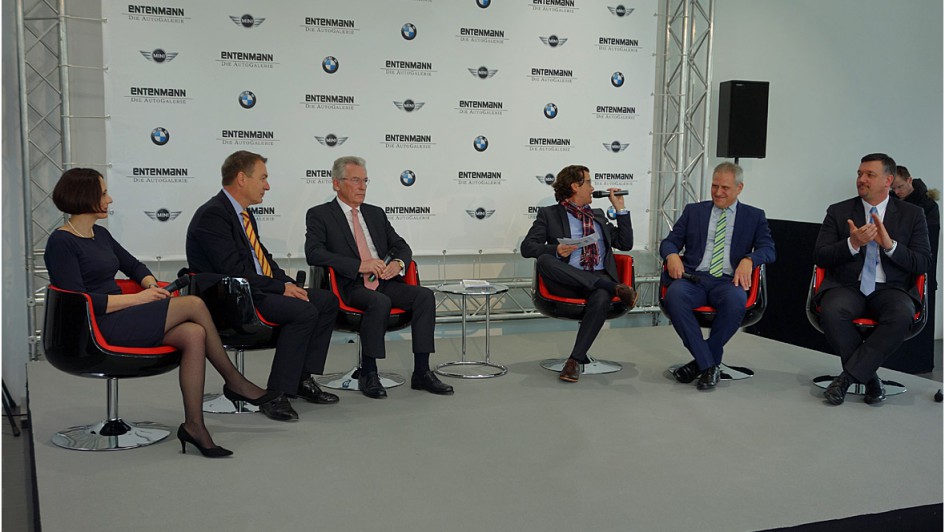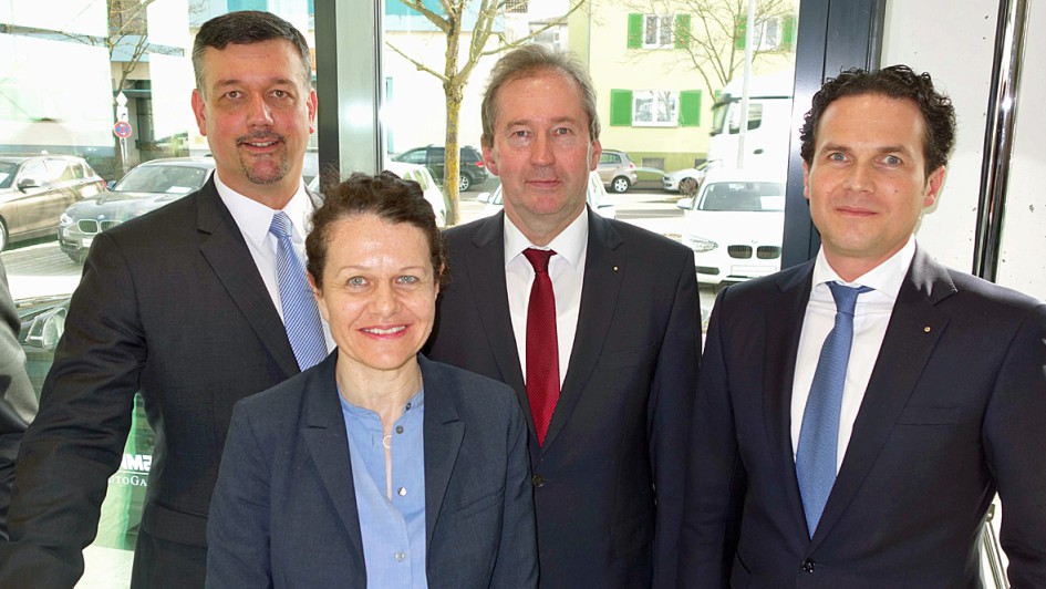 von 10: Zu Gast bei der Eröffnung war auch der BMW-Händlerverband um Präsident Michael Fritze (l.) und den Vizepräsidenten Rolf Heinzelmann (m.) und Peter Reisacher. Mit im Bild: Stefanie Wurst, Marketingleitung Vertrieb Deutschland.
