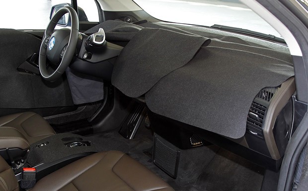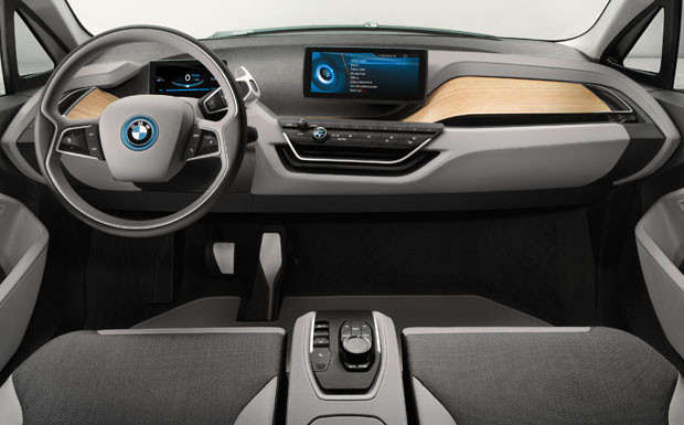 von 12: Auch innen hat der neue i3 große Ähnlichkeit mit dem Coupé-Konzept, Zwei Bildschirme, einer direkt vor dem Fahrer und einer in der Mitte, informieren den Fahrer, offenporiges Holz auf den Oberflächen schmeichelt der Hand.