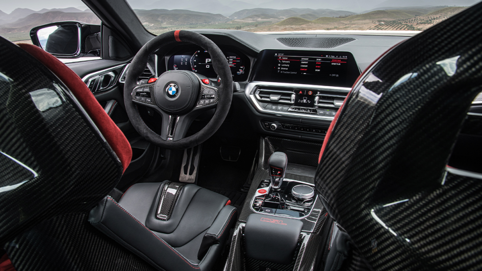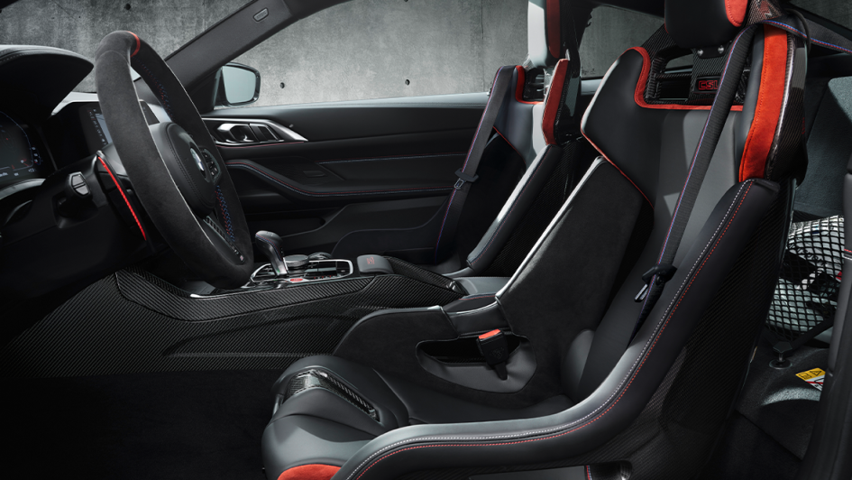von 5: Die Schalensitze sind aus Carbon, die Rückbank wurde komplett entfernt. Stattdessen gibt es hinten ein Netz, unter dem sich Helme befestigen lassen.