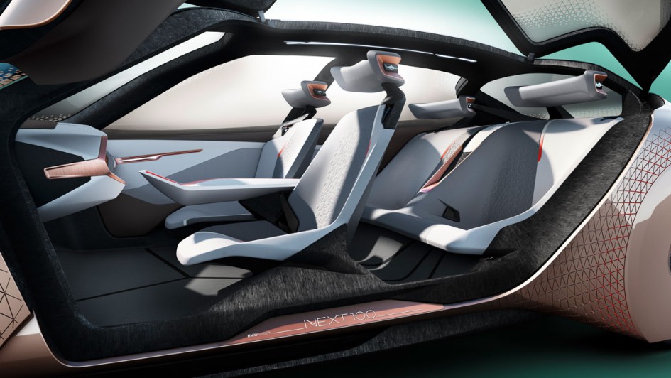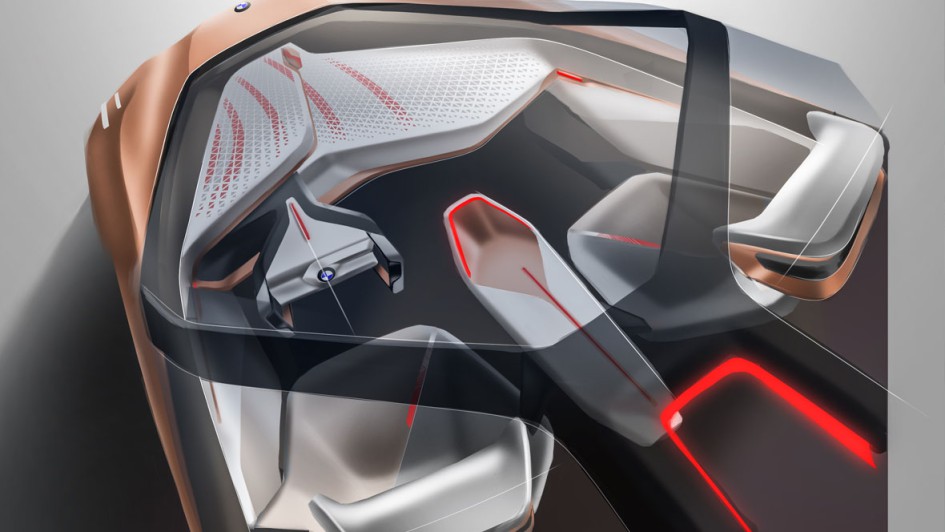 von 11: Beim autonomen, vernetzten Fahren verschwinden Lenkrad und Mittelkonsole, der Innenraum wird zum Wohnzimmer, die Sitze von Fahrer und Mitfahrer drehen sich schräg zueinander.