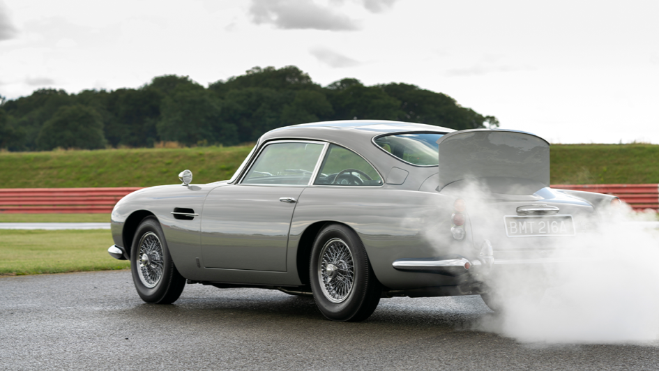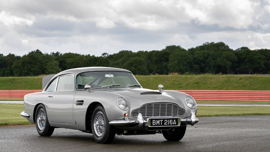 von 4: Für den Streifen "Goldfinger" nach Romanvorlage von Ian Fleming werden bis 1964 zunächst vier DB5 aufgebaut. Alle in "Snow Shadow Grey" mit roter Innenausstattung.
