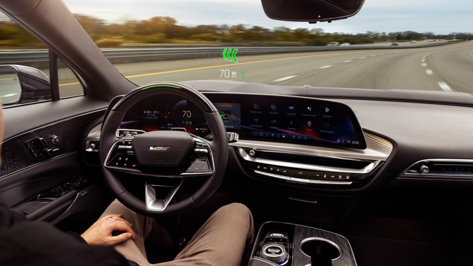 von 10: Unter anderem zeugt ein V-Logo im Lenkrand vom gehobenen Leistungspotenzial des Lyriq-V. Zur Ausstattung des Innenraums gehören ein Panorama-Glasdach, ein 23-Lautsprecher-Audiosystem mit Dolby Atmos und ein 33-Zoll-LED-Display.