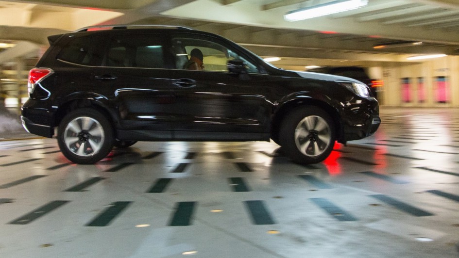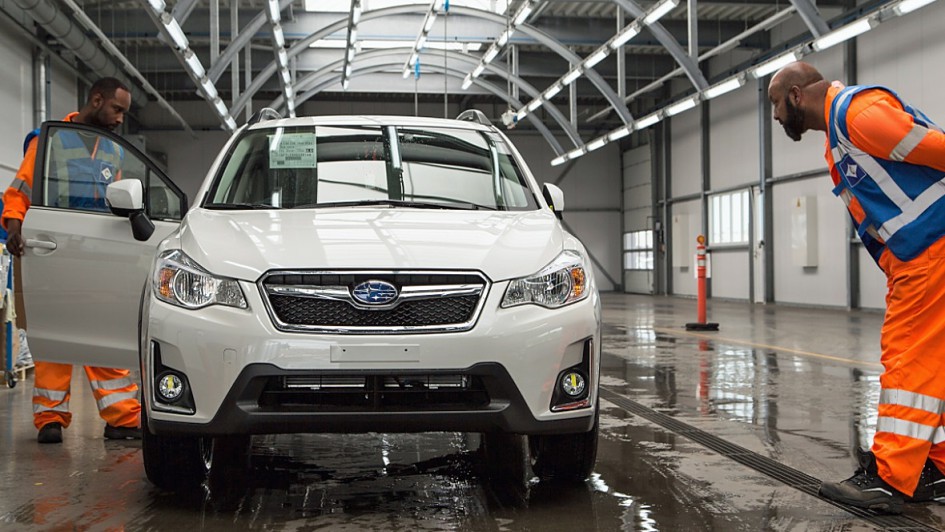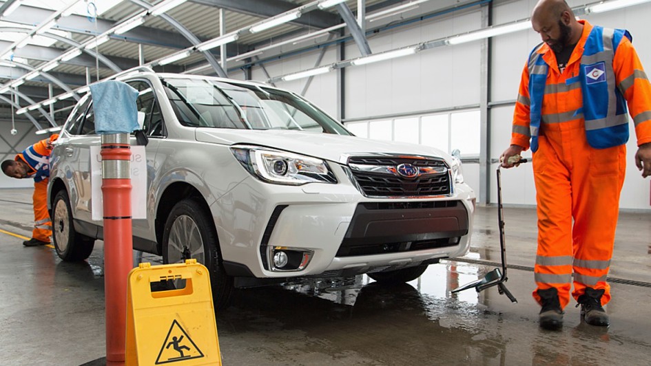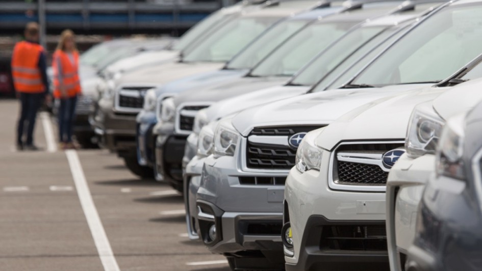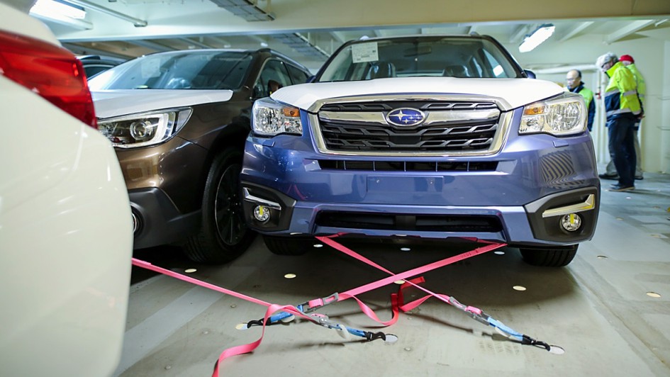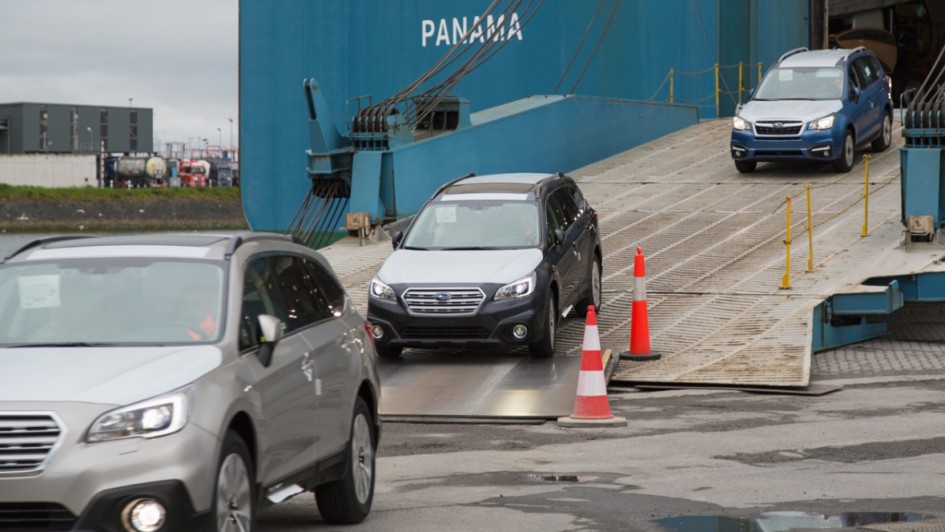 von 13: Drei Subaru Pkw verlassen das Schiff über die Rampe. Sie fahren zum „First Point of Entry“ – und werden dort gewissermaßen europäische Staatsbürger.