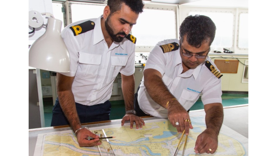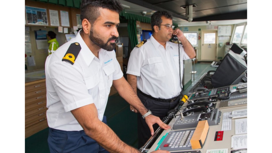 von 13: Der dritte Offizier Jaspreet Singh Salm und Kapitän Sudip Dey auf der Brücke der Euphony Ace. Moderne Technik hilft hier genauso bei der Navigation …