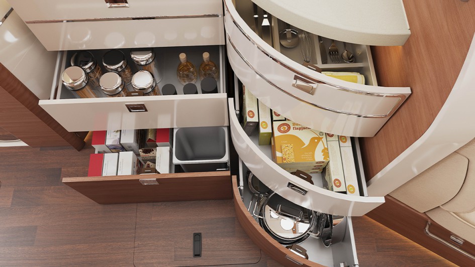 von 8: Die sechs Küchenschubladen sind breiter geworden, und auf Wunsch gibt es einen großen Gasbackofen im Küchenunterschrank, was allerdings auf Kosten von zwei Auszügen geht.
