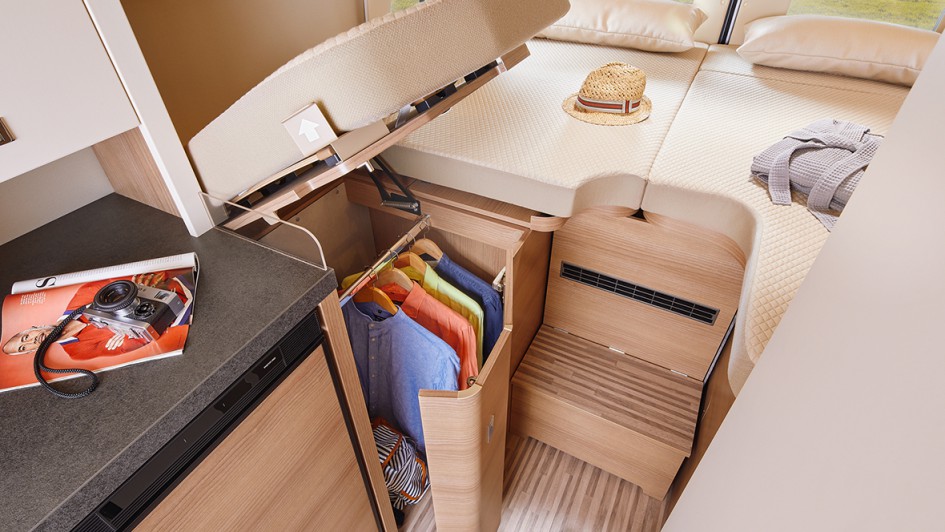 von 8: Der Kleiderschrank findet sich am Fußende unter dem Bett auf der Beifahrerseite und ist per Liftfunktion bequem von oben und vorn zugänglich.