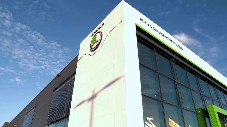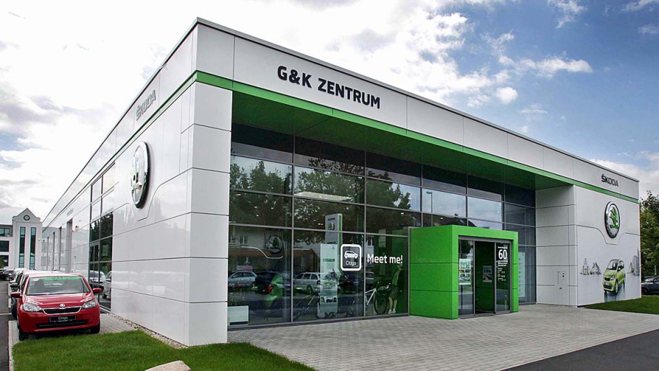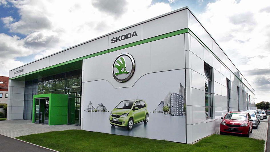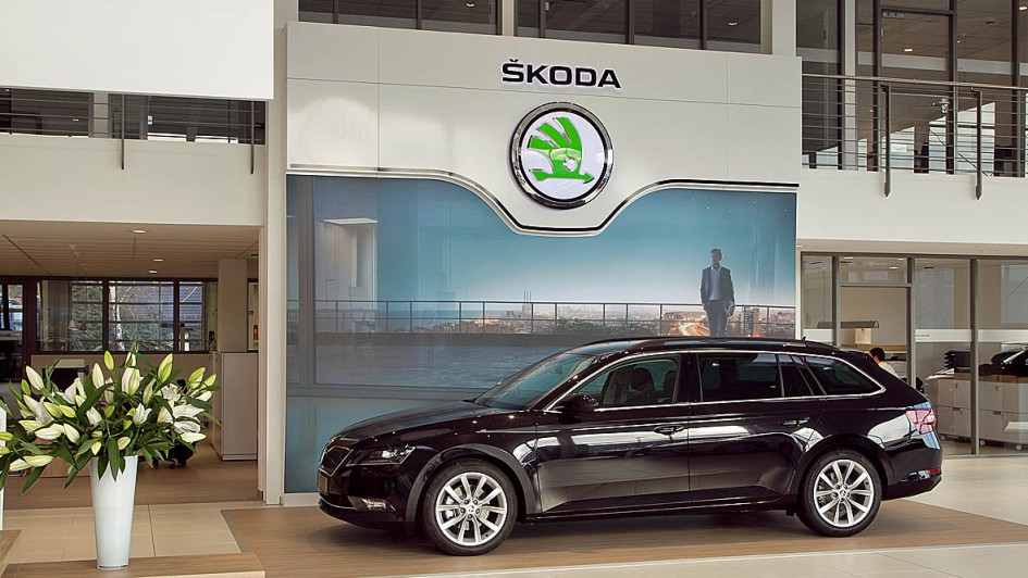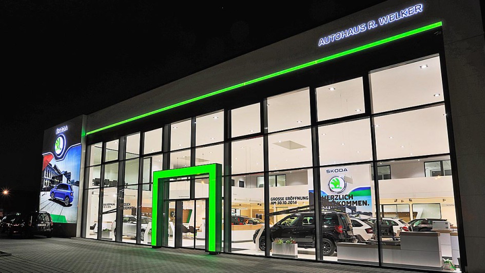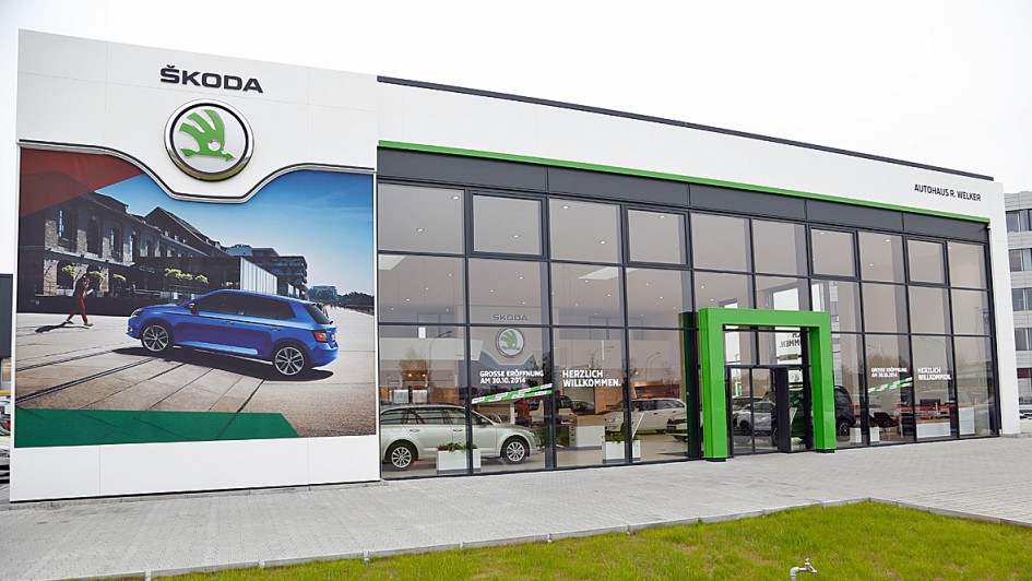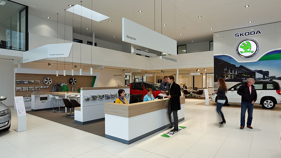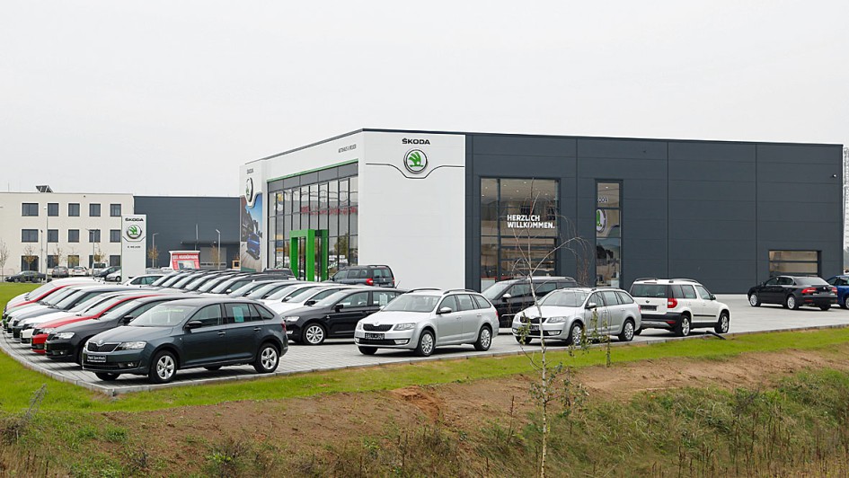 von 12: Jörg Schandert (l.), Geschäftsführer des gleichnamigen Autohauses, zeigte am Freitag seinen neuen Betrieb in Dessau. Skoda-Händlernetzentwickler Volkmar Junge (M.) erläuterte das Konzept gemeinsam mit Alexander von Buzay von der Beratungsfirma BCON.