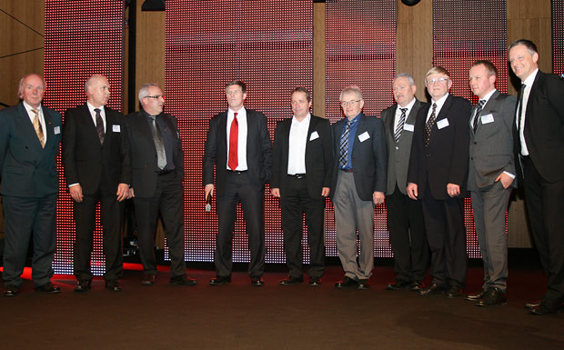 von 12: Während der Abendveranstaltung ehrten Vertriebschef Jörg Seemann (re.) und Geschäftsführer Holger Böhme (4..li.) die Jubiläre unter den Händlern.