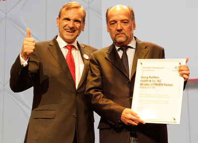 von 8: Geehrt, weil seit 80 Jahren Citroen-Händler: Georg Popp (re.) führt das Autohaus Georg Rüthlein in Würzburg in vierter Generation. Citroen Chef Peter Weis gratuliert.
