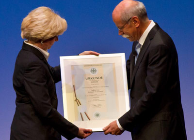 von 22: Genau 125 Jahre nach der Patenteinreichung durch Carl Benz und mehr als 80.000 erteilte Patente später erhielt die Daimler AG ein weiteres Technologie-Patent. Cornelia Rudloff-Schäffer, Präsidentin des Deutschen Patent- und Markenamtes, übergab Zetsche die Urkunde für die so genannte Bipolare Rahmenflachzelle.