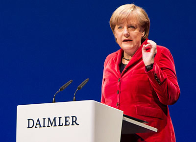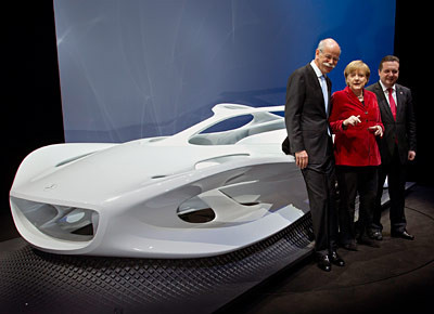 von 22: Dieter Zetsche, Angela Merkel und Stefan Mappus vor der Skulptur Mercedes-Benz “Aesthetics 125”