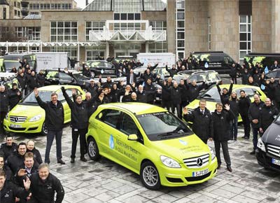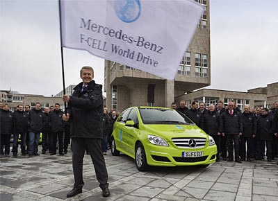 von 22: Von Stuttgart aus starten drei Mercedes-Benz B-Klassen mit lokal emissionsfreiem Elektroantrieb mit Brennstoffzelle ihre 125-tägige Fahrt um die Welt. Über vier Kontinente und durch 14 Länder fahren die drei B-Klasse F-CELL einmal rund um den Globus.