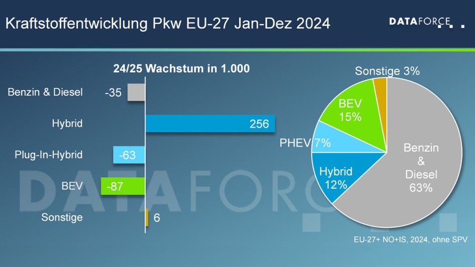 von 7: 2024 war das letzte Jahr der CO2-Verordnung von 2021 mit Zielwerten vor Gewichtsanpassung (116–118 g/km). Die Elektrifizierung wuchs moderat, insgesamt ging der Markt aber zurück – vor allem wegen sinkender BEV-Nachfrage in Deutschland nach dem Wegfall der Förderung. Nur Vollhybride legten mit über 250.000 zusätzlichen Einheiten deutlich zu.