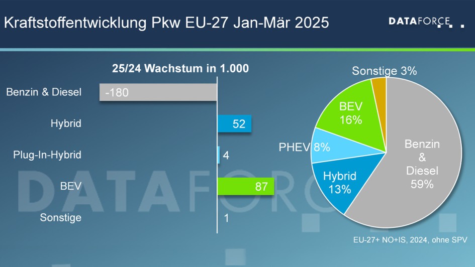 von 7: Betrachtet man die ersten drei Monate des Jahres 2025, so hat sich der Trend völlig verändert. Die Zulassungen von Benzin- und Dieselfahrzeugen sind rückläufig, während BEVs die am schnellsten wachsende Kraftstoffart sind. Die Konstante ist das anhaltende Wachstum der Zulassungen von Vollhybriden.