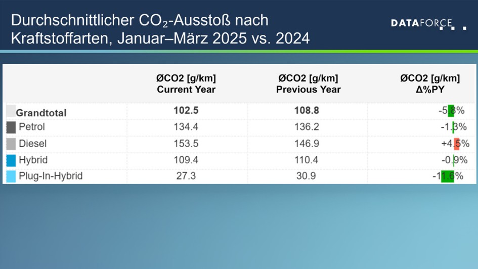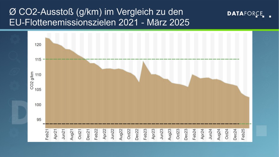 von 7: Es tut sich was: Bis März 2025 ist der CO2-Ausstoß auf 103 g/km gesunken, verglichen mit 109 g/km im März 2024. Obwohl die Fortschritte deutlich sichtbar sind und Januar 2025 der erwartete Grenzwert war, ist die Ziellinie von 93,6 g/km (im Diagramm als schwarze gestrichelte Linie dargestellt) noch recht weit entfernt.