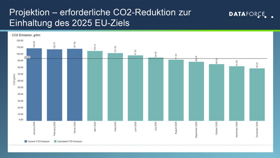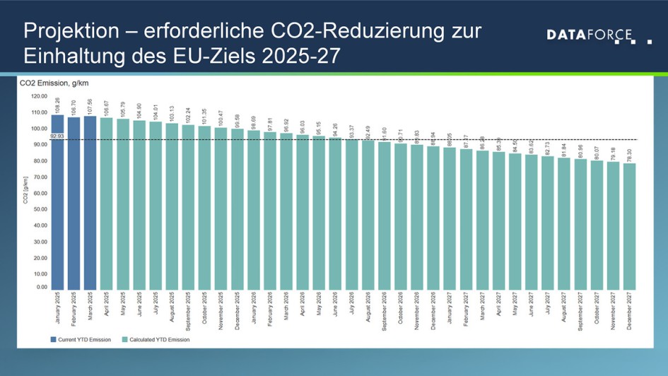 von 7: Zahlenspiel: Betrachtet man eine Marke, die mit durchschnittlichen Emissionen von 107 g/km in das Jahr 2025 gestartet ist, so müsste die Marke ihre Emissionen jeden Monat um mehr als 3 g/km senken, bis sie schließlich im Dezember 2025 CO2-Emissionen von 78 g/km erreicht.