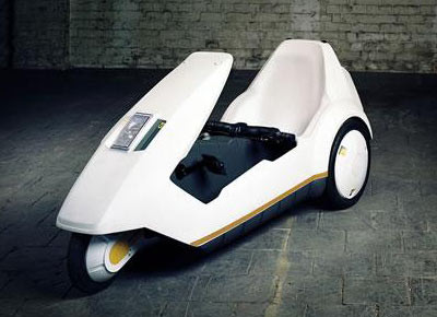 von 9: Sinclair C5, 1985, erstes Elektrofahrzeug in Massenproduktion, Elektromotor 250 W; 0,33 PS; 25 km/h, Gewicht 45 kg; technische Besonderheit: Karosserie aus Vollkunststoff