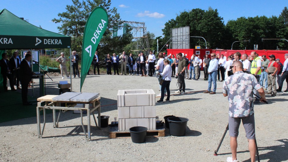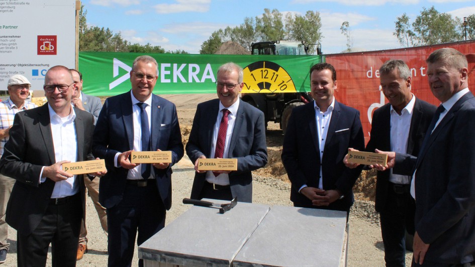 von 10: v.li.: Guido Kutschera, Vorsitzender der Geschäftsführung der Dekra Automobil GmbH, Rainer Genilke, Minister für Infrastruktur und Landesplanung des Landes Brandenburg, Hendrik Fischer, Staatssekretär im Ministerium für Wirtschaft, Arbeit und Energie des Landes Brandenburg, Klaus Prietzel, Bürgermeister der Gemeinde Schipkau, Erik Pellmann, Fachbereichsleiter Dekra Technology Center Klettwitz und Siegurd Heinze, Landrat des Landkreises Oberspreewald-Lausitz, vollzogen die Grundsteinlegung.
