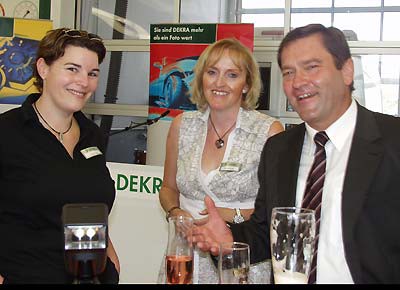 von 14: Bester Stimmung (v.l.): Anton Eschbaumer, Gutachtenchef der NL München und Leiter der Außenstelle München-Ost, Dekra Automobil-Chef Clemens Klinke, Geistlicher Rat Herbert Kellermann, Thomas Holz, Leiter der Kfz-Zulassungsstelle München-Stadt, Hans-Peter Rauch, Leiter der Dekra-NL Bayreuth, Rudi Sedlmeier, Inhaber einer großen Lkw-Werkstatt in Feldkirchen, Valentin Magori, Referatsleiter Verkehrswesen im Bayerischen Verkehrs- und Wirtschaftsministerium (staatliche Aufsichtsbehörde für das Kfz-Prüfwesen), Schwertransport-Unternehmer Wallek sen. als Nachbar der Dekra-Prüfstelle München-Ost, Astrid Zollner, Leiterin der Dekra-Akademie München und TÜV-Prüfstellenleiter Dick (Unterhaching bei München).