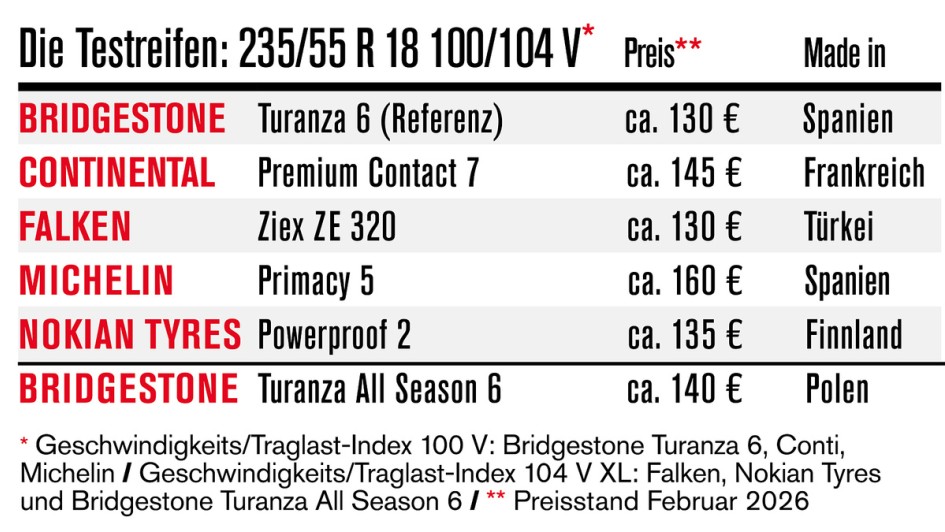 von 18: In unserem Sommerreifentest sind fünf bekannte sowie brandneue Top-Pneus der Dimension 235/55 R18 und ein anerkannt guter Vertreter der All-Season-Fraktion vertreten.