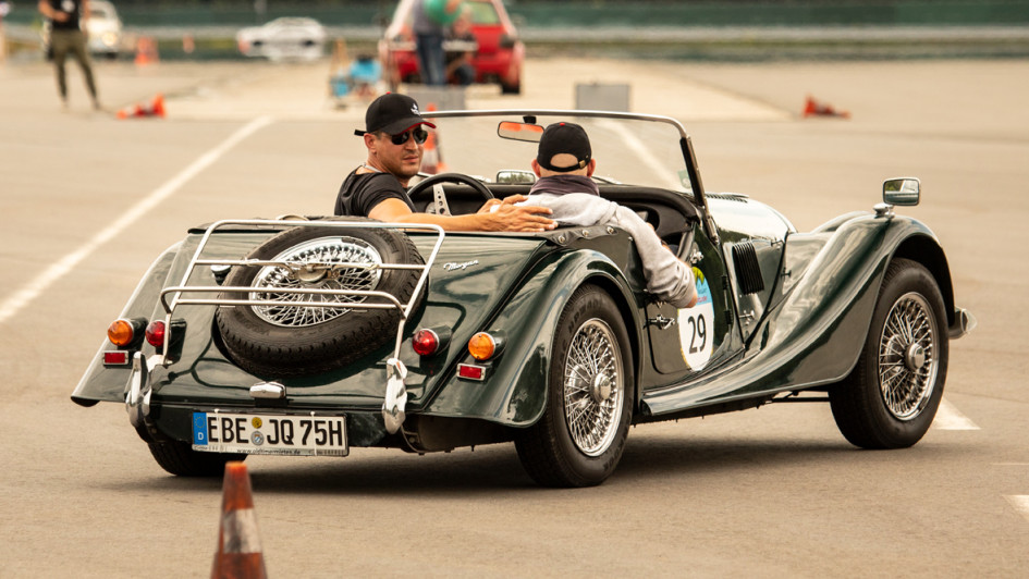 von 14: In einem Morgan 4+4 Roadster fiel das Rückwärtsfahren umso leichter - für Auto1 war Dincer Kumru am Steuer, begleitet von Oliver Kosan.