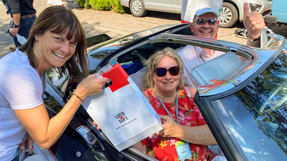 von 14: Sponsor Loco-Soft war durch Pia (M.) und Wolfgang Börsch vertreten, die eine Corvette C3 mitbrachten. Juliane Schleicher (l.), AUTOHAUS, begrüßte das Team 32 bei der Zieleinfahrt.