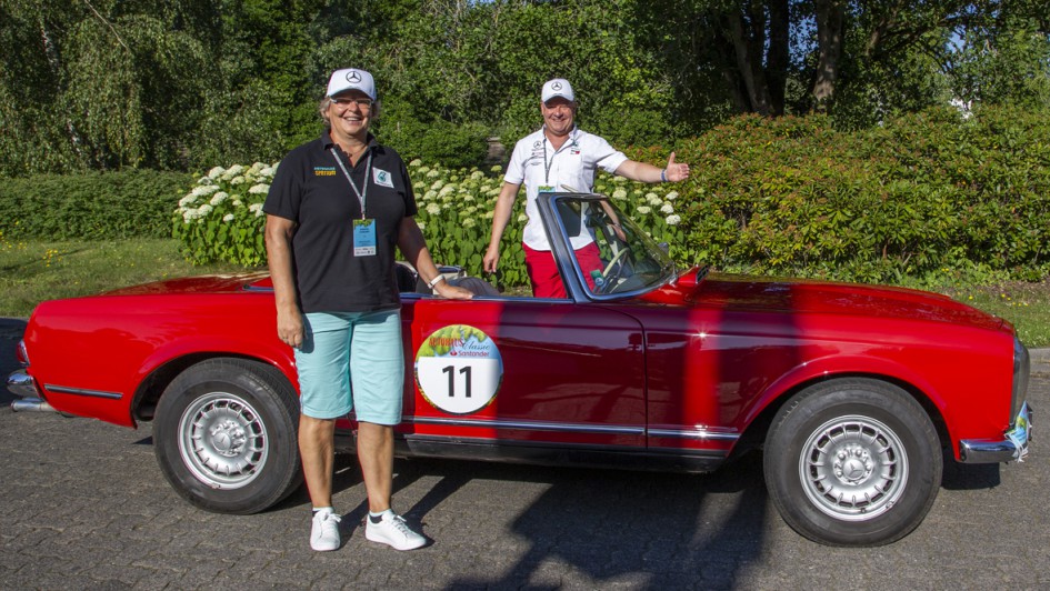 von 14: Für Petronas waren Barbara Schrumpf und Bernd Volk zu Gast auf der Rallye. In einer roten Mercedes Pagode ging das Team 11 an den Start.