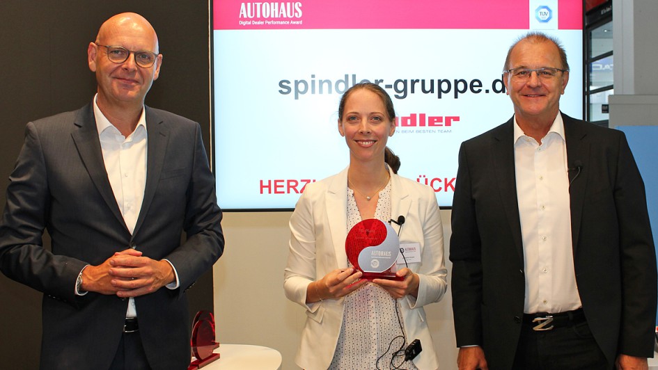 von 15: 10. Platz: Autohaus Spindler - Axel Bischopink (Chief Operating Officer TÜV SÜD Division Mobility), Jeannine Krenn (Geschäftsführerin Autohaus Spindler) und Ralph M. Meunzel (Chefredakteur AUTOHAUS; v.l.n.r.)